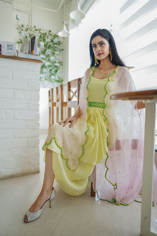 Coral Printed organza saree with Coral Blouse(set of 2)