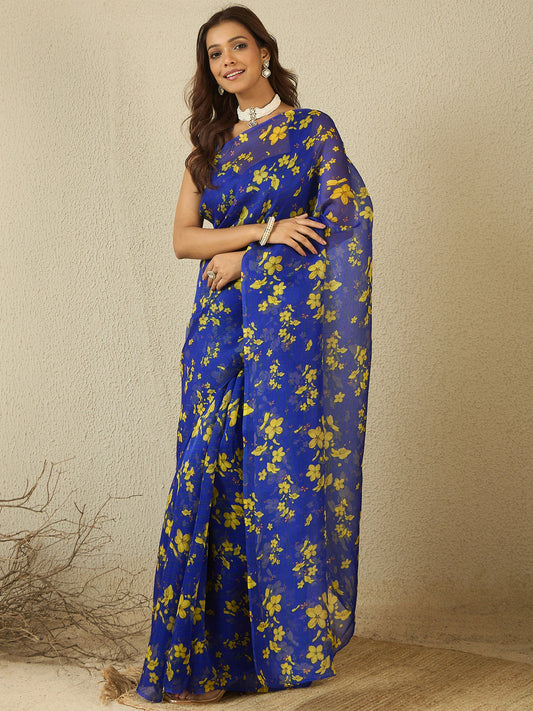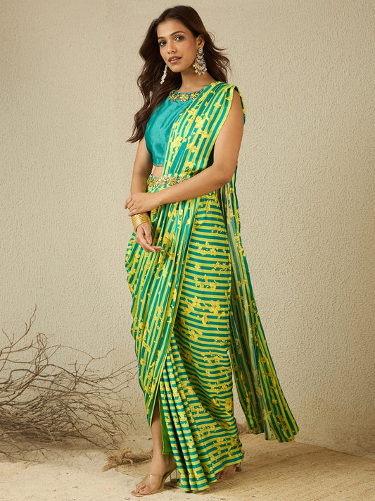 Emerald green lime stripes pre-draped saree with blouse (set of 2)