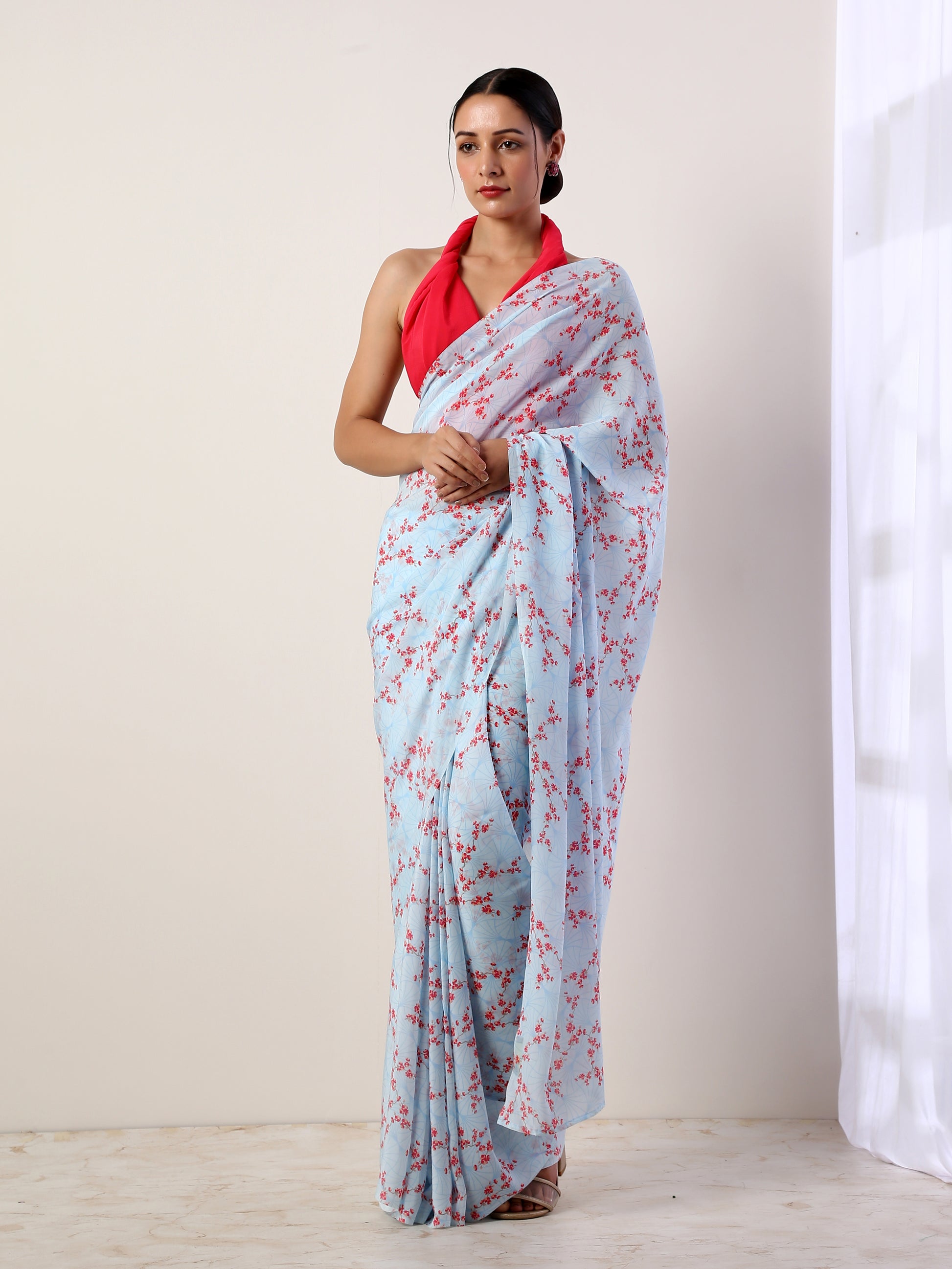Our custom 'Sakura' print is thoroughly inspired by the overwhelming beauty of the elusive pink flower on the Japanese geometrical patterns bringing together the Japanese and Indian culture. Featuring a printed sky blue crepe saree. It comes with a carrot red unstitched blouse.